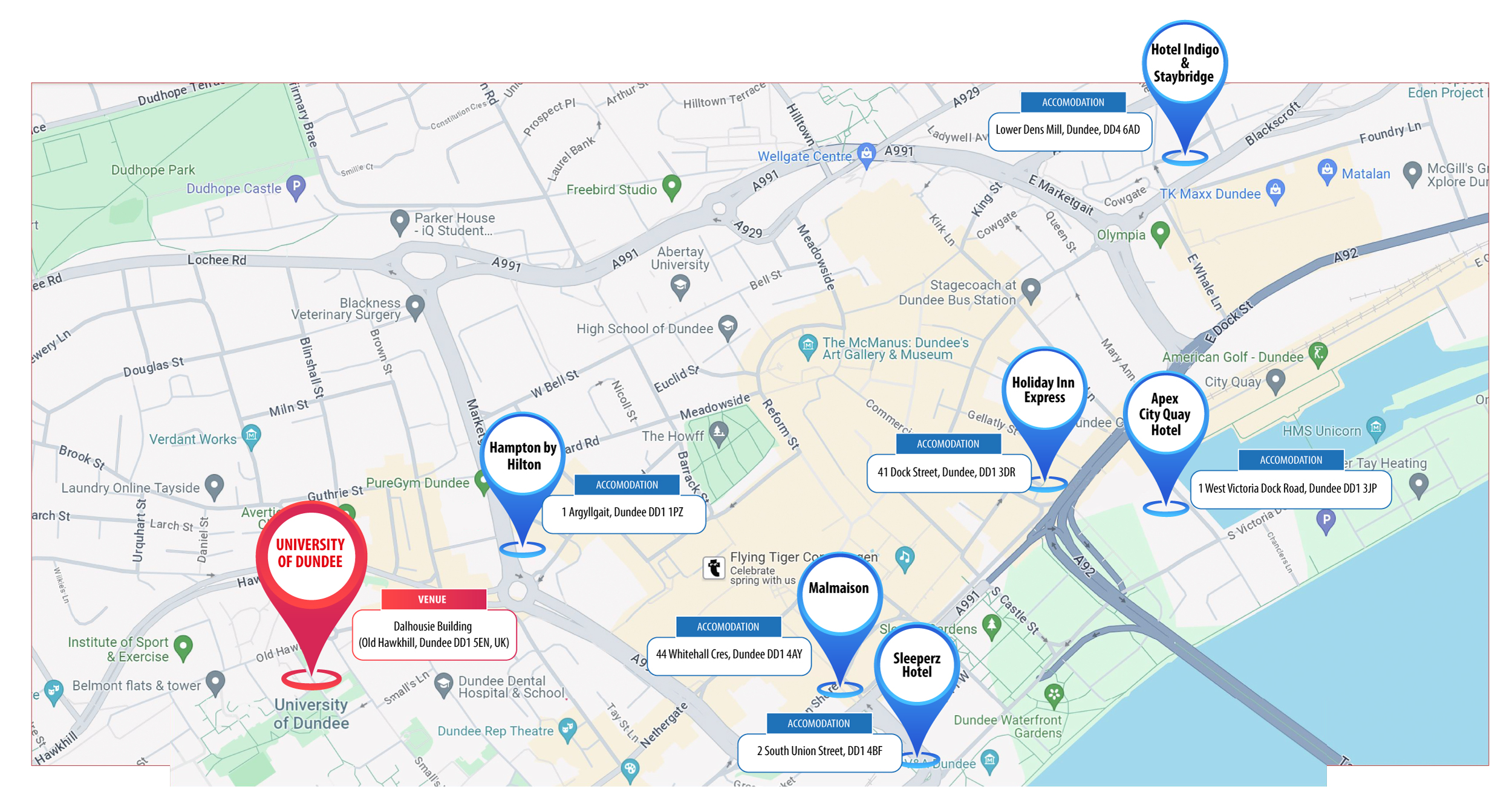 Location of all the hotels we offer is in proximity to the University of Dundee (Dalhousie Building) venue.