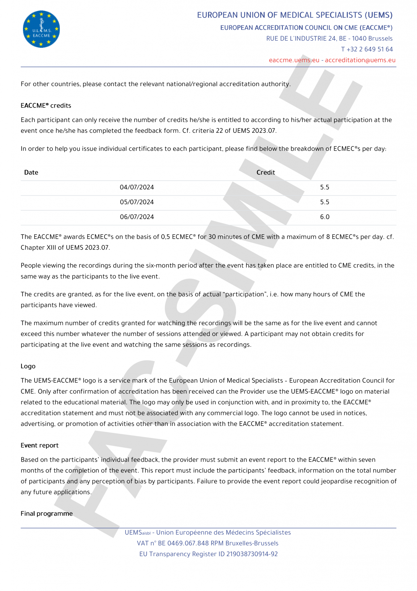 We are pleased to inform you that your application for EACCME® accreditation of 7th World Bronchiectasis Conference, Dundee, Scotland 04/07/2024 – 06/07/2024 has been granted 17.0 European CME credits (ECMEC®s) by the European Accreditation Council for Continuing Medical Education (EACCME®).