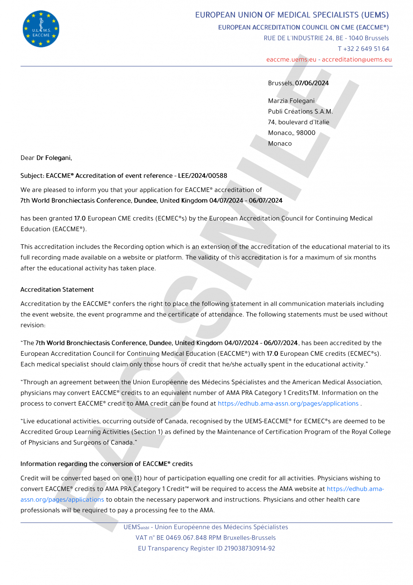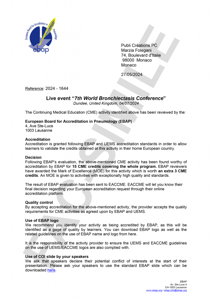 We are pleased to inform you that your application for EACCME® accreditation of 7th World Bronchiectasis Conference, Dundee, Scotland 04/07/2024 – 06/07/2024 has been granted 17.0 European CME credits (ECMEC®s) by the European Accreditation Council for Continuing Medical Education (EACCME®).